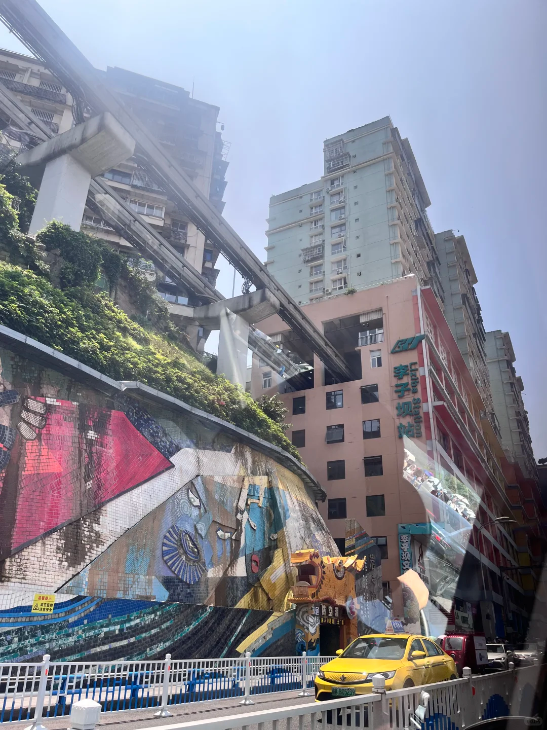 📍 市区打卡: 寄存完行李,冲去李子坝看轻轨穿楼名场面 。坐两站地铁到皇冠大扶梯,2元/人的票价,下行扶梯速度直接拉满 !老人真得捏把汗 。