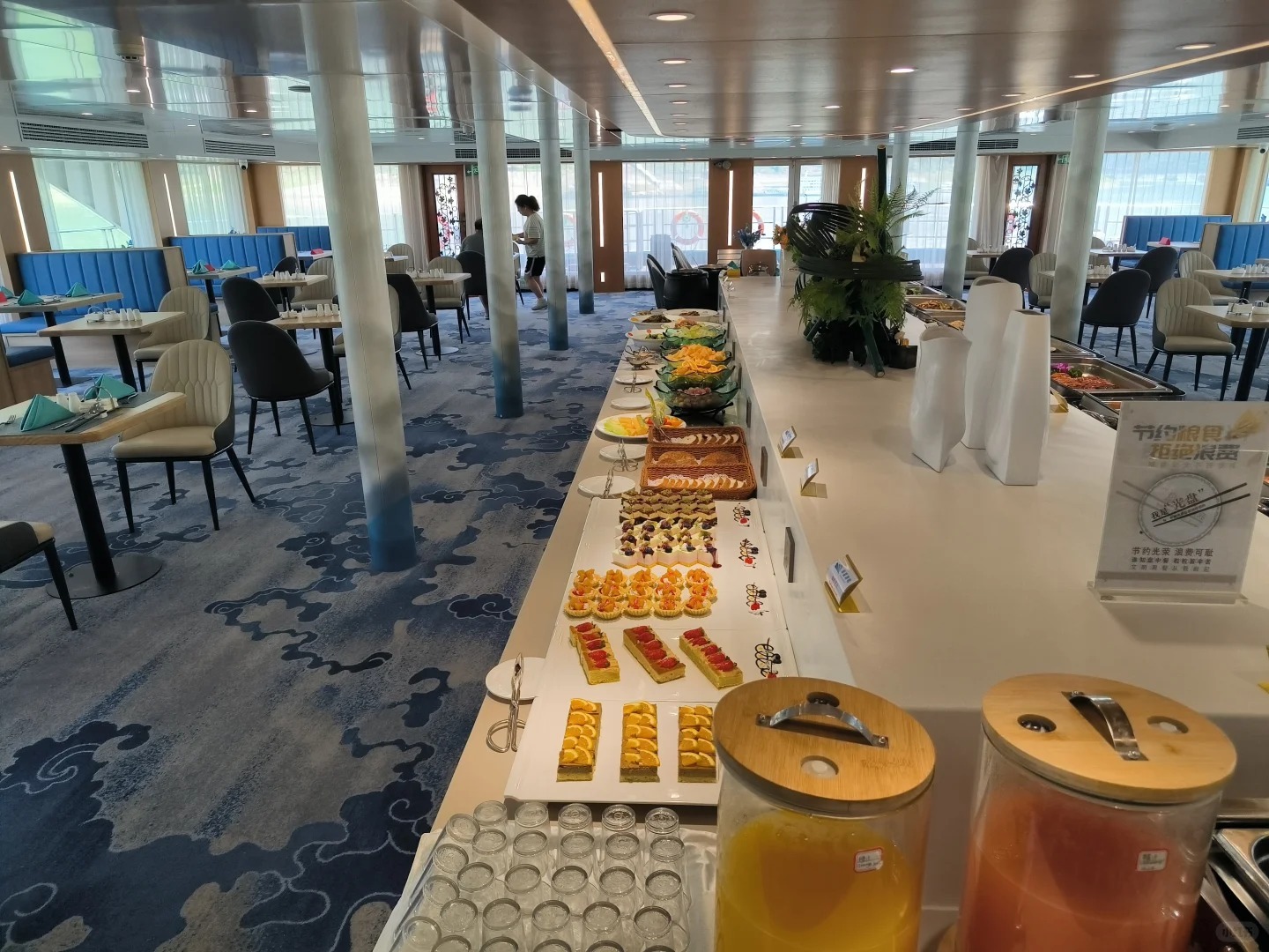 重庆出发,4天3晚 day1 下午登船-登船晚餐(免费),人太多根本抢不过,不是吃不饱,是抢不到,后面会上菜,最后能吃饱。升楼层到了4层,餐食升级,孩子满6岁全价,体验感比较好,不用抢了。